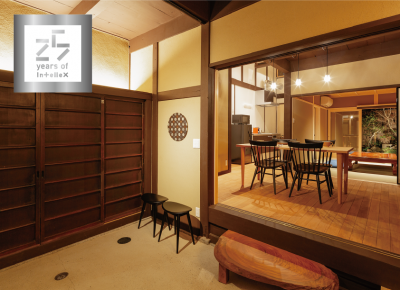 住むように泊まれる、長期滞在可能な宿。1階の広い「ミセノマ」から眺める切子格子と、重厚な蔵戸がつくる陰影が美しい。〈最大7名/一棟貸し〉
